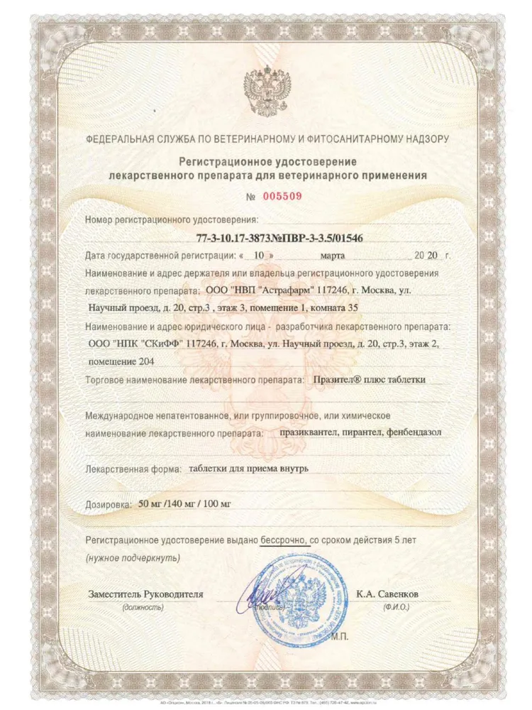 Празител плюс для собак до 20 кг – антигельминтный препарат для собак в форме таблеток. Предназначен для лечения и профилактики заражения основными видами круглых и ленточных глистов. В качестве действующих веществ в своем составе содержит Пирантела памоат, Фенбендазол и Празиквантел.Рекомендуется глистогонить собаку за 10 дней до вакцинации.Профилактика и лечение нематодозов и цестодозов у собак.Состав1 таблетка содержит:Празиквантел – 50 мг