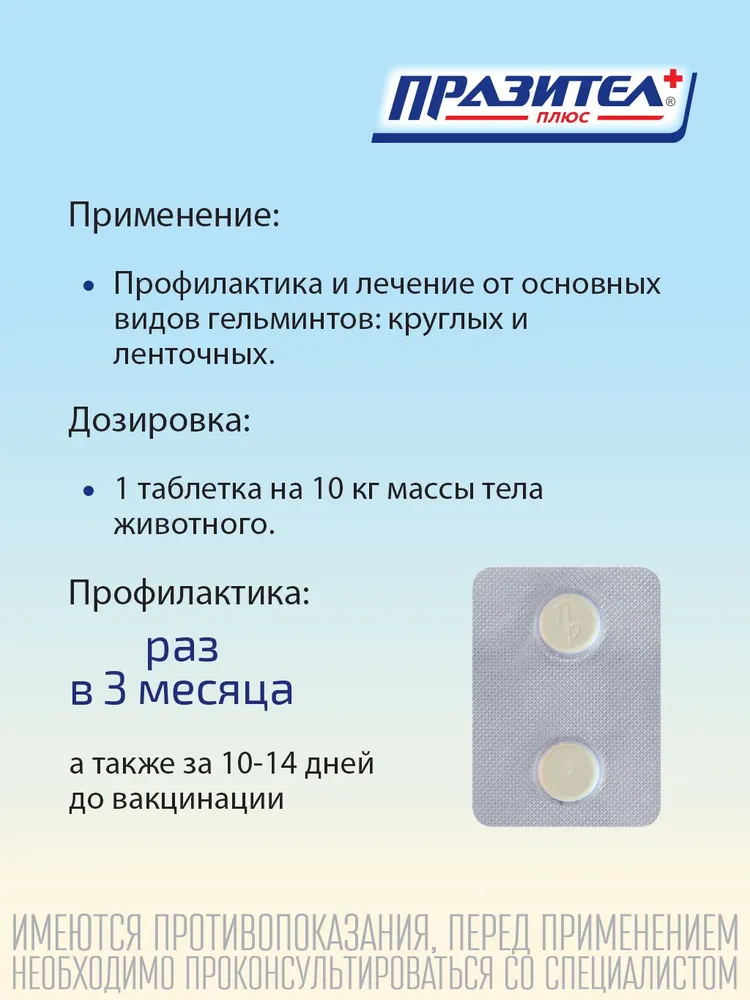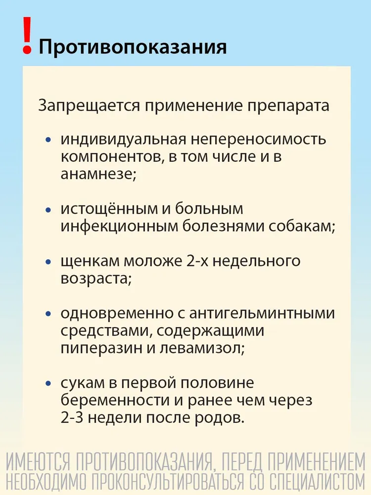 Препарат не рекомендуется истощенным и больным инфекционными болезнями животным.Не применять препарат одновременно с антигельминтными средствами, содержащими пиперазин.Таблетки - 2 шт.