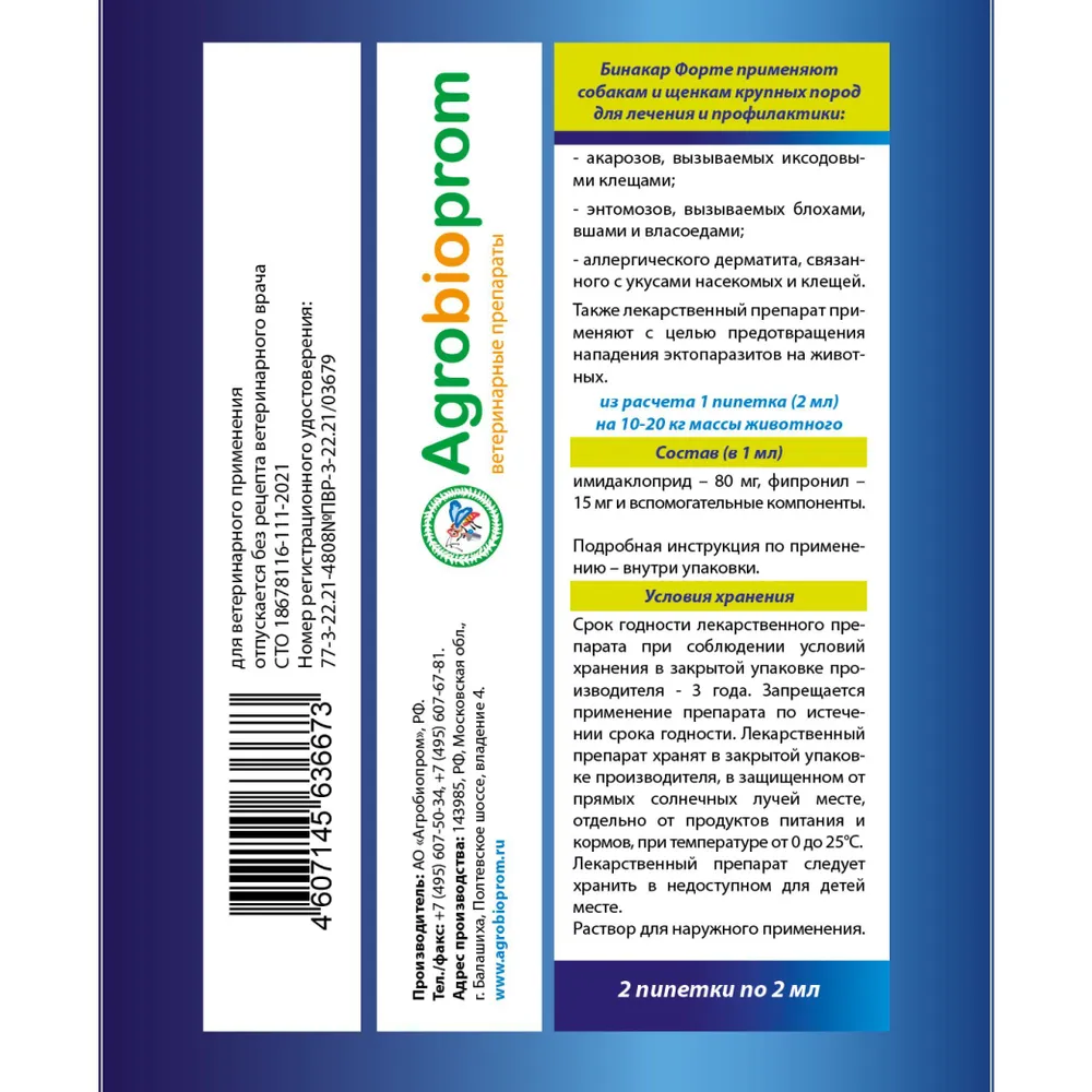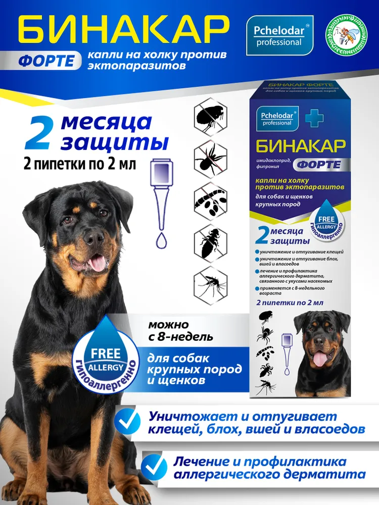 Вы заботитесь о здоровье и комфорте своего четвероногого друга? Тогда вам точно понравится Бинакар - эффективное средство от блох для собак крупных пород. Забудьте о проблемах, связанных с блохами, и наслаждайтесь безмятежным времяпровождением со своим питомцем.Блохи - это не только неприятные паразиты, но и потенциальная опасность для здоровья вашей собаки. Они могут вызвать аллергические реакции, передавать инфекции и даже вызывать анемию. Бинакар - ваш надежный союзник в борьбе с этими неприятностями.Специально разработанная формула Бинакар обеспечивает надежную защиту от блох и их личинок. Его действующие вещества быстро и эффективно уничтожают взрослых особей и предотвращают размножение, что позволяет избежать повторного заражения.Бинакар - это не просто средство от блох, но и забота о здоровье вашей собаки. Его уникальная формула содержит витамины и микроэлементы, которые укрепляют иммунитет и способствуют улучшению общего состояния животного. Ваш питомец будет здоровым и активным.Применение Бинакара очень простое. Просто нанесите несколько капель на шерсть вашей собаки и распределите их по всему телу. Средство быстро впитывается и начинает действовать, обеспечивая надежную защиту на протяжении длительного времени.Бинакар - это не просто средство от блох, но и забота о комфорте вашего питомца. Оно не вызывает дискомфорта и не оставляет жирных следов на шерсти. Ваша собака будет чувствовать себя комфортно и свободно.Выбирая Бинакар, вы выбираете надежность и качество. Это средство прошло все необходимые клинические испытания и получило положительные отзывы от владельцев собак. Не рискуйте здоровьем своего питомца - выбирайте Бинакар!