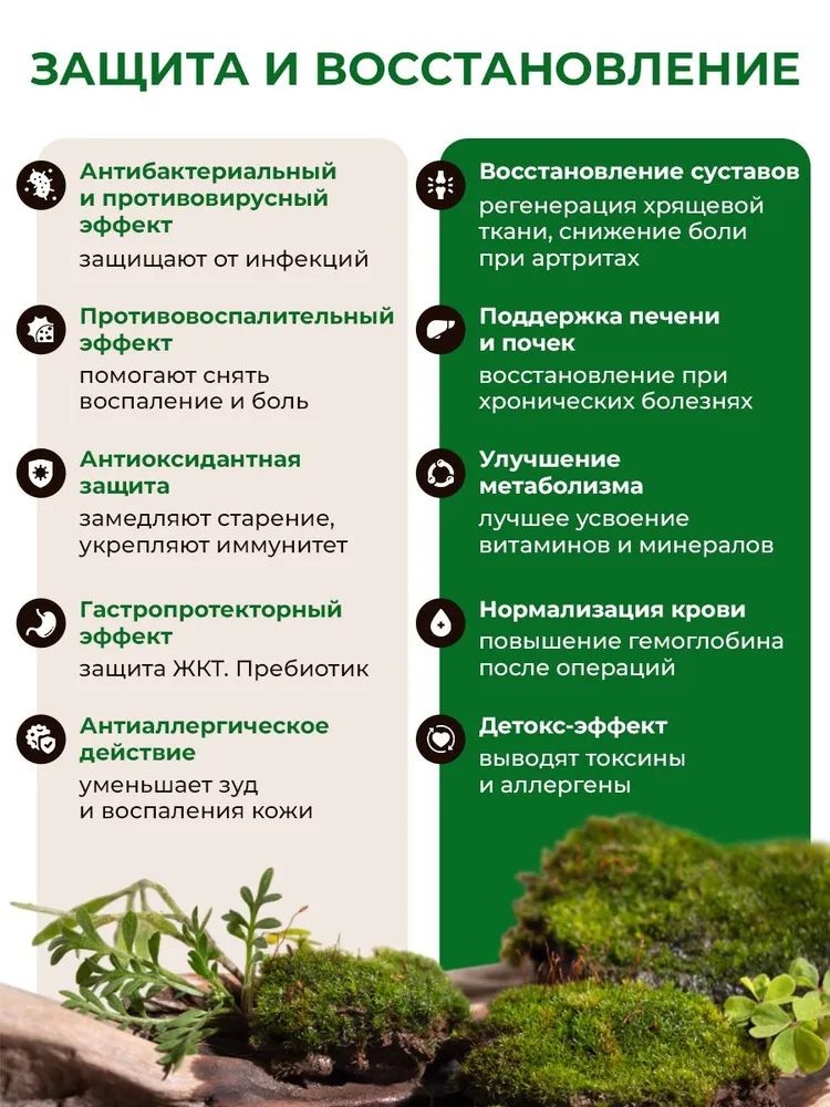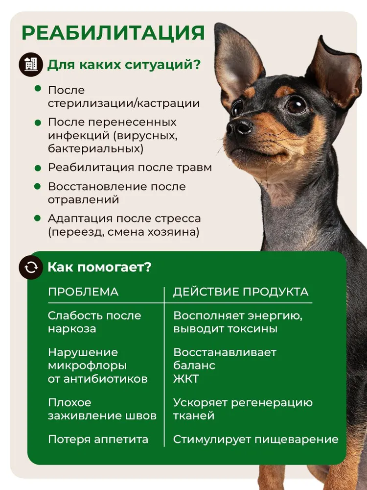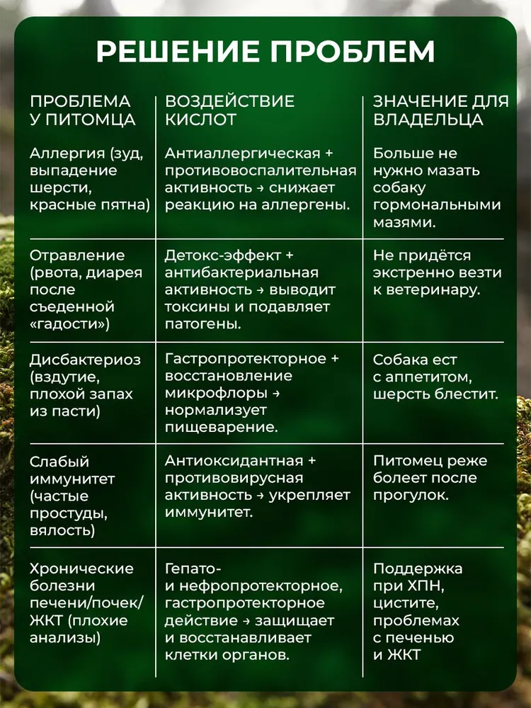 Какие проблемы решают:улучшают пищеварение, работу ЖКТ и функцию печени,ускоряют обмен веществ;восстанавливают микрофлору кишечника, повышают кишечный иммунитет;эффективный пребиотик- подавляет грибки и патогенные бактерии;улучшают усвоение белка и кальция, усиливают расщепление пищи;от аллергии;помощь при интоксикациях , отравлениях, детокс;защита слизистых;защита от проникновения вирусов в клетки организма;повышение иммунитета и сопротивляемости к заболеваниям;повышение гемоглобина;поддержка суставов и костей;регенерация хрящевой ткани;помощь при воспалительных заболеваниях;ускорение регенерации тканей при травмах;от выпадения шерсти, способствуют улучшению состояния кожи и шерсти собаки;для улучшения качества шерсти, делают шерсть более здоровой и блестящей;поддержка здоровой беременности;повышение энергии и выносливости.Насыщают организм натуральными:Витаминами: C, B1, B2, PP, каротиноиды, токоферолы ;Макро и микроэлементами: кремний, кальций, железо, калий, медь, сера, фосфор ;Аминокислотами: всего 15 , в том числе незаменимые - лизин, валин, метионин, фенилаланин, триптофан, лейцин;Ферментами: гидролазы, оксидоредуктазы, трансферазы ,синтетазы;Жирными и фульвовыми кислотами;Олиго и полисахаридами.улучшают качество жизни и внешний вид животных,незаменимы для стерилизованных, кастрированных и пожилых собак.Применение:0,5-1 мл на 1кг веса животного, при недомогании дозу можно увеличить