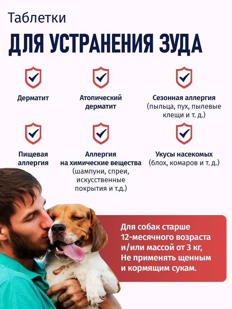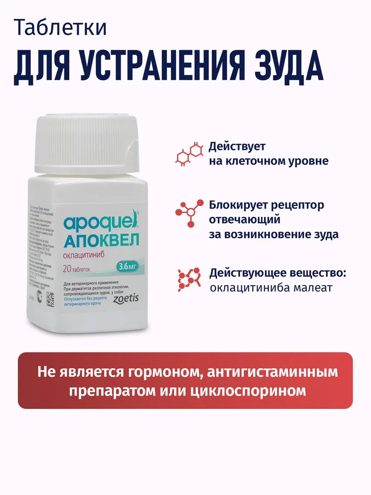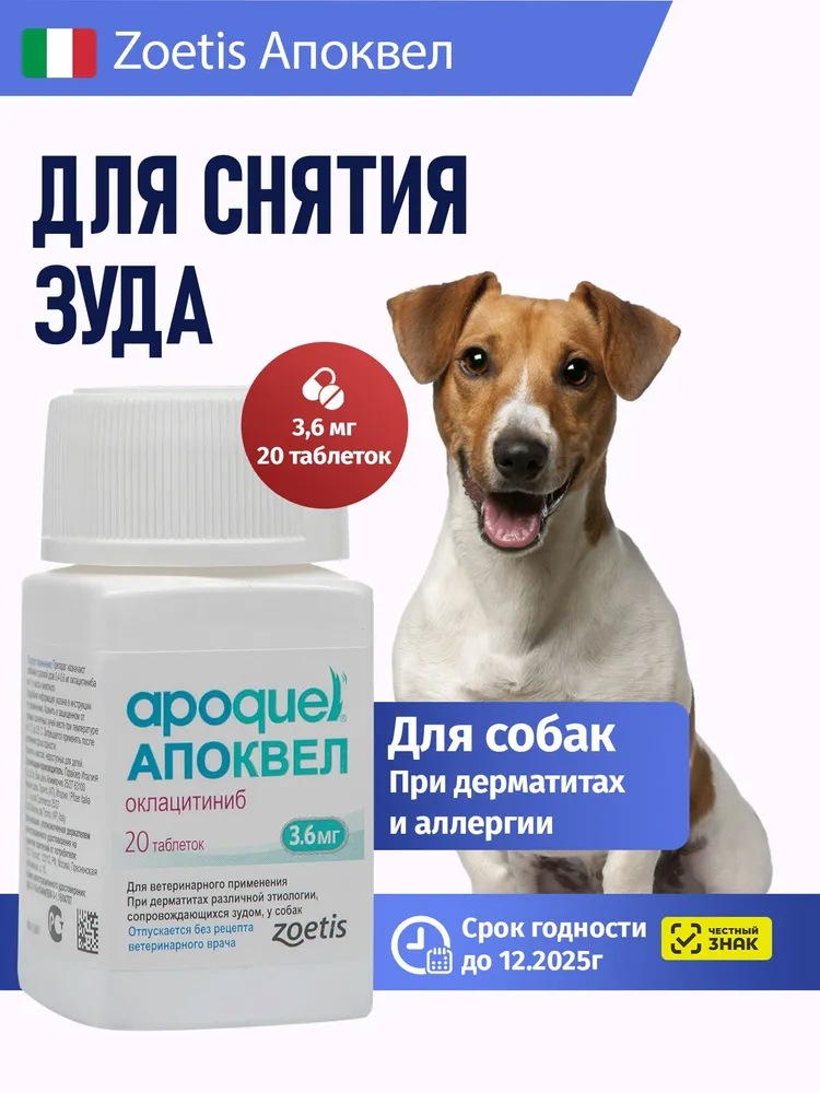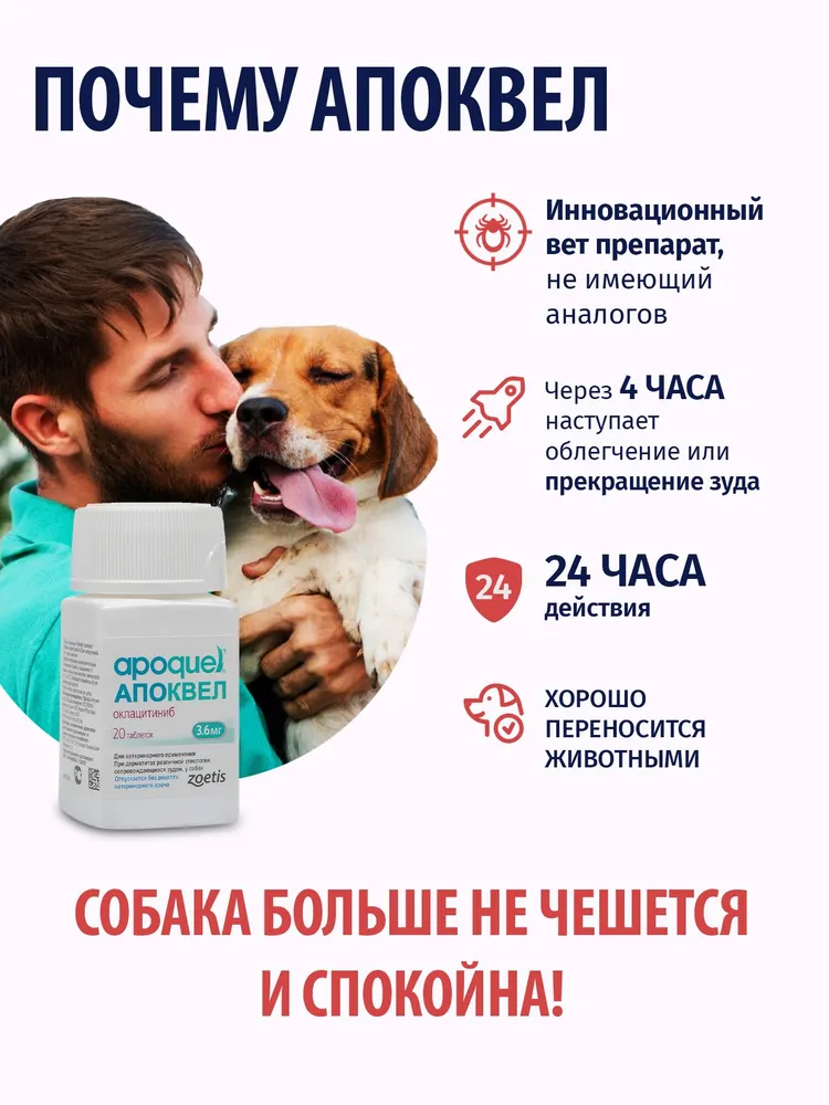 Апоквел – инновационный ветеринарный препарат для снятия аллергического зуда и воспаления кожи у собак в возрасте от 12 месяцев и старше, весом более 3-х кг.\nАпоквел не имеет аналогов! Единственный препарат класса ингибиторов янус-киназ, разрывающий цикл зуда и воспаления при дерматите у собак. \n•\tдействует на клеточном уровне, блокируя рецептор отвечающий за возникновение зуда.\n•\tНачинает действовать с первого дня приема. Облегчение или прекращение зуда наступает в среднем через 4 часа после приема первой дозы.\n•\tХорошо переносится животными.\n•\tПодходит для купирования острых и хронических состояний.\n•\tНе является гормоном, антигистаминным препаратом или циклоспорином.\n•\tСнимает воспаление и отек кожи, возникающие при расчесах;\n•\tПрепарат нового класса, созданный специально для собак;\n•\tУдобно применять. Апоквел действует 24 часа. Можно применять независимо от приема пищи;\nПрепарат применяют для снятия зуда, вызванного различными аллергенами:\n- дерматит, атопический дерматит\n- сезонная аллергия (пыльца, пух, пылевые клещи и т. д.)\n- пищевая аллергия\n- укусы насекомых (блох, комаров и т. д.)\n- аллергия на химические вещества (шампуни, спреи, искусственные покрытия и т.д.)\nСобака больше не чешется и спокойна, а врач может продолжать обследование, чтобы выявить причину основного заболевания\nВажно: Апоквел снимает зуд и воспаление, но не устраняет причину заболевания. Необходимо посетить ветеринарного врача, для постановки диагноза и назначения полного курса лечения.\n•\tНе вызывает негативных последствий на организм собаки, связанных с приемом стероидов. Оказывает доказанное терапевтическое действие на симптомы аллергии у собак в отличие от антигистаминных препаратов;\n•\tМожно применять долго. При атопическом дерматите, под наблюдением ветеринарного врача Апоквел можно применять длительно;\n•\tНе влияет на вакцинацию (необходима консультация ветеринарного врача);\n•\tМожно применять с другими препаратами. Можно применять с вакцинами, антибиотиками, НПВС и др. Он не оказывает влияния на их действие. Необходима консультация с ветеринарным врачом;\n•\tНе оказывает влияния на результаты диагностических тестов при аллергии. Можно использовать в период проведения диагностики.\nНе допускается применение препарата собакам, с признаками иммуносупрессии, такими как гиперадренокортицизм, а также собакам, с прогрессирующими злокачественными новообразованиями. Не следует применять препарат кобелям в период вязки, собакам моложе 12-месячного возраста и/или массой менее 3 кг, а также щенным и кормящим сукам.\nСрок годности лекарственного препарата при соблюдении условий хранения - 2 года с даты производства.