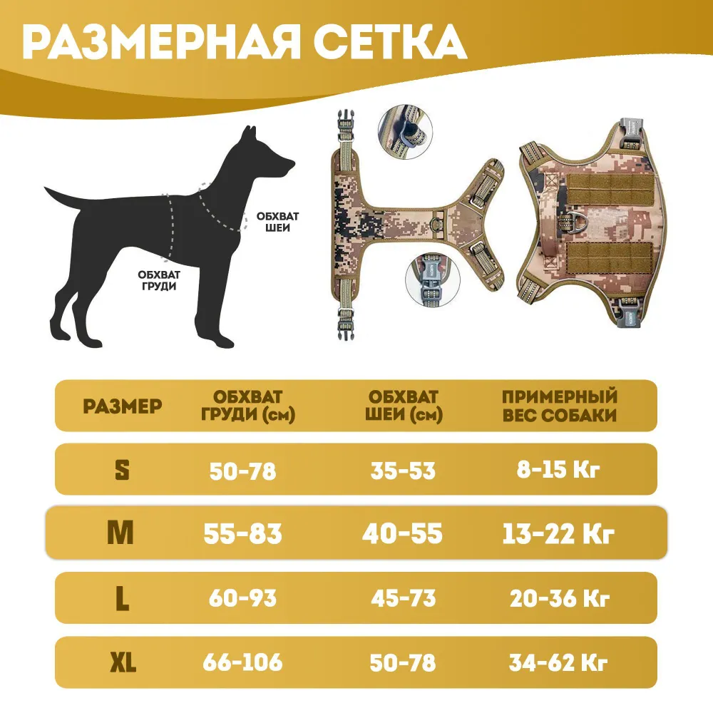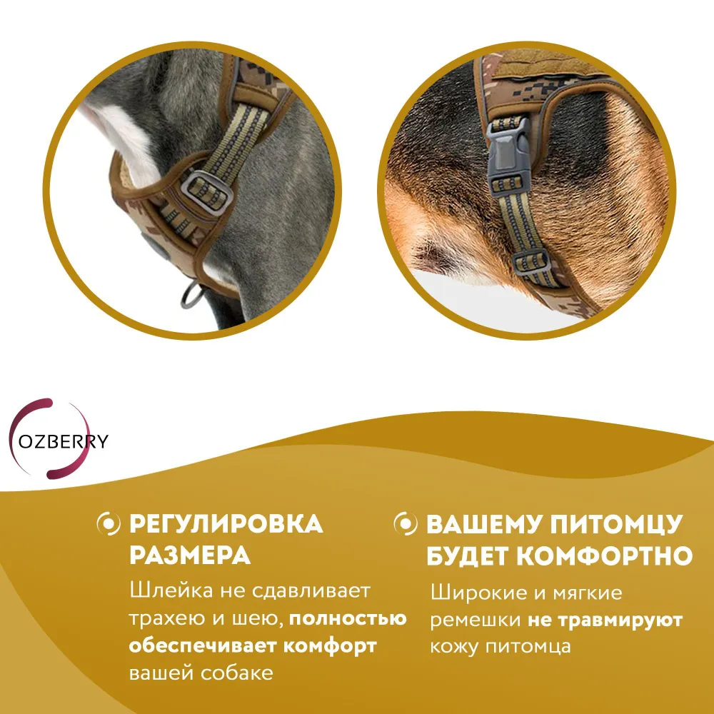 МНОГОФУНКЦИОНАЛЬНАЯ ШЛЕЙКАпредназначена для безопасного и комфортного выгуливания и дрессировки вашей собаки. Тактическая экипировка, которая позволяет вам заниматься спортом и ходить в походы вместе с вашим питомцем. Также шлейка для собак – замечательная альтернатива ошейнику.РАЗМЕР. Подойдет для собак с параметрами:Охват по груди: 55-83 см.Обхват шеи: 40-55 см.Примерный вес: 13-22 кг.ВЫСОКОЕ КАЧЕСТВОАнатомическая собачья шлейка от бренда OZBERRY выполнена из высокотехнологичного материала. Сверхпрочный, легкий и водостойкий нейлон плотностью 900 D прошит надежной строчкой с двух сторон.ПРОДУМАННАЯ КОНСТРУКЦИЯ. Тактическая военная шлейка для собак содержит 4 ремня (2 плечевых и 2 нагрудных). Они обеспечивают плотную посадку и максимальную мобильность. Ремни регулируются. На жилете есть светоотражающие элементы и табличка для информации о собаке, для безопасности вашего питомца во время прогулки. Материал легко очищается и моется. Крепкое кольцо и ручка смогут удержать вашего питомца при рывках, не травмируя шею собаки, а вас уберечь от травм рук.ПРОДУМАННАЯ КОНСТРУКЦИЯТактическая военная шлейка для собак содержит 4 ремня (2 плечевых и 2 нагрудных). Они обеспечивают плотную посадку и максимальную мобильность. Ремни регулируются. На жилете есть светоотражающие элементы и табличка для информации о собаке, для безопасности вашего питомца во время прогулки. Материал легко очищается и моется. Крепкое кольцо и ручка смогут удержать вашего питомца при рывках, не травмируя шею собаки, а вас уберечь от травм рук.БЕЗОПАСНОСТЬ И КОНТРОЛЬ. Специальная прочная ручка жилета помогает обезопасить вашу собаку в момент сдерживания. Удобные пряжки и регулируемые ремни обеспечивают полную и надежную посадку жилета на собаке. Наш ошейник для собак подходит для средних и крупных пород. Мягкая подкладка служит для защиты от любых нагрузок и для защиты кожи вашей собаки, а дышащая воздушная сетка обеспечивает комфорт. Шлейка крепко обхватывает шею, грудь и часть спины пса, позволяя ему легко передвигаться, не сковывая движений. К жилету можно прикрепить игрушки и другие необходимые вещи при помощи липучек для крепления аксессуаров, а также регулируемых подвязок для крепления груза. Поводок для собак крепится к кольцу на спине.РАЗНООБРАЗИЕ ПРИМЕНЕНИЯШлейка для собак крупных пород идеально подойдет для личного использования, для правоохранительных органов, охоты, походов, путешествий и профессиональных тренировок с вашим любимым питомцем. А также предназначена для работы по защитным курсам дрессировки.Купить Шлейку для собаки от бренда OZBERRY — значит выбрать действительно качественный товар! При создании нашей продукции мы стремимся к достижению максимально высокого качества с сохранением выгодных для покупателя цен. Будем искренне благодарны вам за отзыв о нашем товаре!