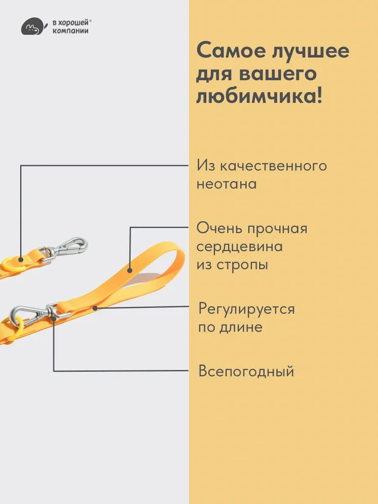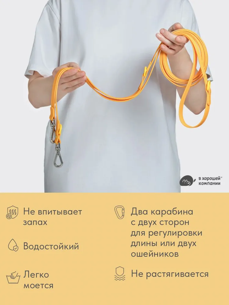 Вы и ваш питомец заслуживаете только лучшее! Именно поэтому мы предлагаем вам поводок от бренда IN GOOD COMPANY, который обязательно порадует вас и вашего четвероногого друга. Регулируемый поводок - идеальное решение для взрослых собак мелких и средних пород, а также незаменимый аксессаур для выгула щенков и кошек. Больше не нужно подбирать несколько изделий для каждого животного, ведь вы легко можете выбирать оптимальную длину перестегивая карабин. Перестежка с двойным карабином обеспечивает максимальную безопасность, позволяя выгуливать двух питомцев сразу. Выполнен из прочного и водостойкого материала, который не впитывает запахи, не растягивается и легко моется. Для большей надежности дополнительно усилен внутри нейлоновой лентой. Особенностью этого прогулочного поводка является его утончённый дизайн - удобная и мягкая ручка не натирает руку даже во время длительных и активных прогулок по улицам, а цвет, подойдёт к любому наряду вашего любимца. Крепкий, надежный и продуманный в каждой детали - доверьтесь нам, и мы не подведем!