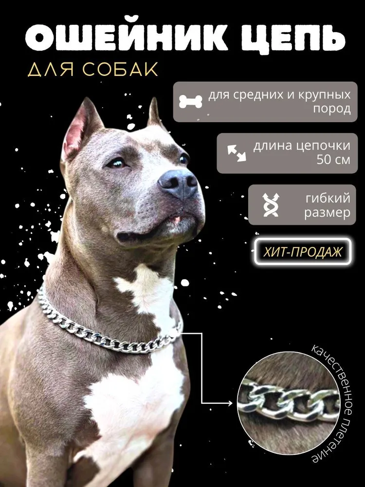 Стильный и модный ошейник цепочка для собак - это не только украшение для вашего питомца, но и полезная амуниция для прогулки и дрессировки. Ошейник украшение представлен в золотом и серебряном цветах. Длина изделия 50см. Легкая цепочка для собаки свободно висит на шее и не натирает её. В качестве застежки на металлическом ошейнике используется надежный карабин. Он удобен в использовании и легко застегивается. Ошейник цепочка регулируется по длине, поэтому подходит для собак средний и крупных пород. Достаточно просто убрать несколько звеньев. Также на ошейник для собак с легкостью можно подцепить поводок. Ещё одним важным аксессуаром является адресник, который тоже можно подвесить на цепочку, чтобы в случае потери, животное смогли вернуть домой. Красивый чокер ошейник для собак подчеркнёт благородство и статусность породы. Это отличный подарок для тех, кто только завёл питомца.Чтобы не столкнуться с проблемой разрушения украшения нужно:- Беречь от воды;- Снимать во время занятий спортом;- Защищать от высоких температур;- Надевать в последнюю очередь;- Вытирать насухо от воды- Снимать на ночь.