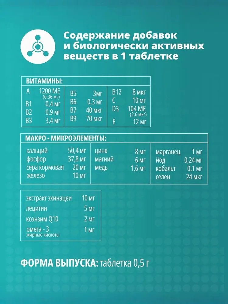 кальций 50, 4 мг - фосфор 37, 8 мг - сера кормовая 20 мг - железо 10 мг - цинк 8 мг - магний 6 мг - йод 2, 4 мг - медь 1, 6 мг - марганец 1 мг - кобальт 0, 1 мг - селен 24 мкг. Экстракт эхинацеи 10 мг - лецитин 5 мг - коэнзим Q10 2 мг - омега-3