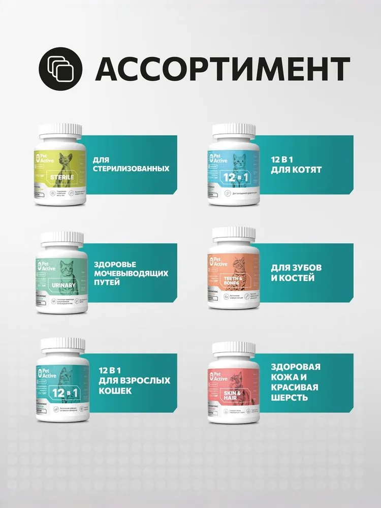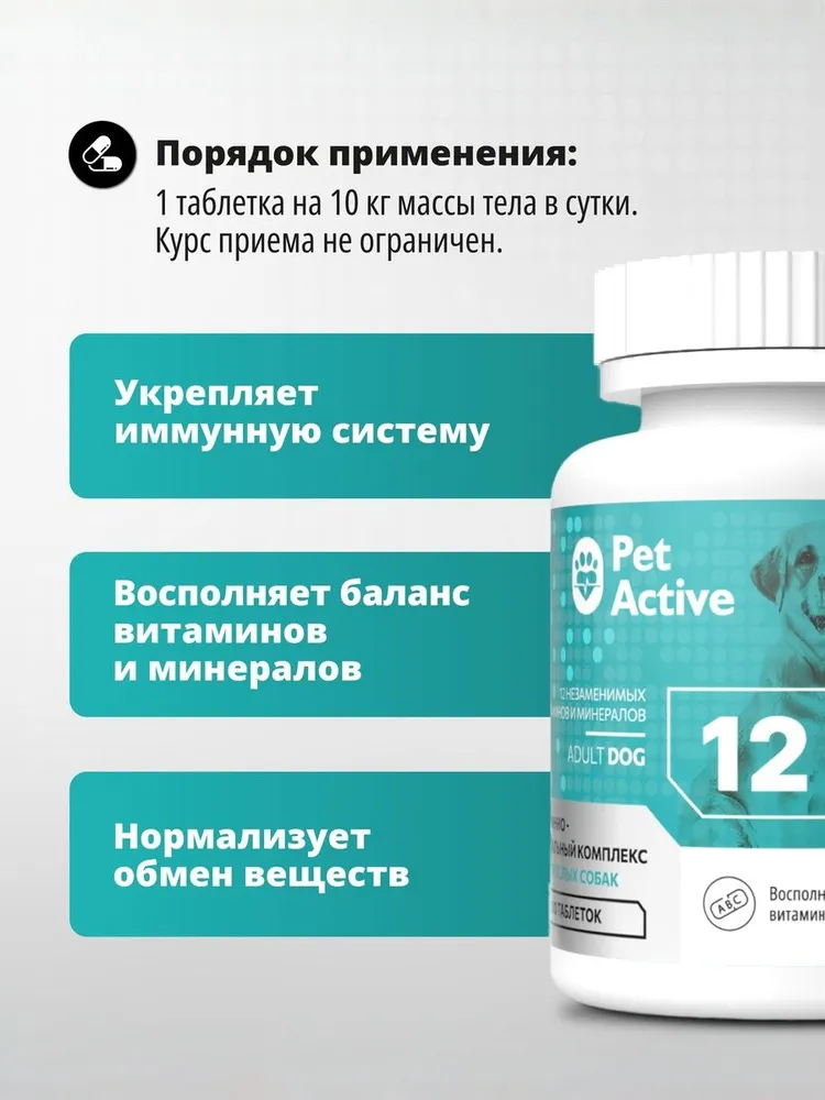 Витаминно - минеральный комплекс PetActive для кошек и собак – создан для полноценного ухода за здоровьем питомцев, содержит необходимые витамины и минералы, которые помогают сохранять бодрость и отличное самочувствие каждый день. Комплексный подход: необходимые витамины и минералы в одной формуле.\nЗдоровье питомцев: поддерживает иммунитет, здоровье кожи, шерсти, суставов и сердца, зубов и костей.\nУдобство применения: подходит как для кошек, так и для собак разных пород. \nБез использования искусственных красителей и ароматизаторов.