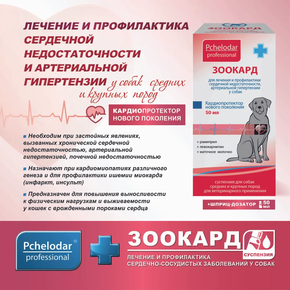 Суспензия для лечения заболеваний сердца у собак "Зоокард"Забота о здоровье вашего питомца - это важная задача, особенно когда речь идет о заболеваниях сердца. Зоокард предлагает эффективное решение для лечения сердечно-сосудистых заболеваний у собак. Это средство разработано с учетом всех особенностей организма домашних животных, что делает его незаменимым для владельцев, стремящихся обеспечить своим любимцам долгую и здоровую жизнь.Состояние сердца напрямую влияет на общее самочувствие и активность собаки. При первых признаках недомогания, таких как усталость, одышка или изменения в поведении, важно обратиться к ветеринару. Однако, помимо профессиональной помощи, использование специализированных препаратов, таких как Зоокард, может значительно улучшить состояние вашего питомца.Это средство подходит для собак средних пород и содержит компоненты, способствующие нормализации работы сердца. Важно помнить, что здоровье вашего животного зависит не только от медикаментов, но и от правильного питания. Обратите внимание на качественный корм, который обеспечит необходимыми витаминами и минералами.Не забывайте о профилактике. Ваша собака может столкнуться с различными паразитами, такими как блохи и клещи. Использование капель, таких как Бинакар, поможет защитить вашего питомца от этих опасностей. Также стоит рассмотреть возможность использования глистогонных средств Фенпраз, чтобы предотвратить появление глистов.Не забывайте о важности регулярных ветеринарных осмотров. Это поможет вовремя выявить возможные проблемы и начать лечение.Заботьтесь о своем питомце, и он ответит вам безграничной любовью и преданностью. Выбирайте только качественные товары и следите за здоровьем вашего любимца. Зоокард — это ваш надежный помощник в заботе о сердечном здоровье собак.Для лечения заболеваний сердца у собак и кошек "Мекситар"Забота о здоровье вашего питомца — это залог его долгой и счастливой жизни. Если ваша кошка или собака страдает от заболеваний сердца, вам необходимо обратить внимание на эффективные и безопасные средства лечения. Мекситар — это современный препарат, специально разработанный для восстановления здоровья сердечно-сосудистой системы у кошек и собак. Он помогает улучшить общее состояние животного и поддерживает его активность.При выборе средства важно учитывать особенности породы и возраст вашего питомца. Мекситар подходит как для взрослых, так и для маленьких, что делает его универсальным решением для всех владельцев. Важно помнить, что здоровье вашего питомца напрямую зависит от качества питания. Используйте только высококачественные корма, которые обеспечат необходимыми витаминами и минералами.Кроме того, не забывайте о профилактике заболеваний. Регулярные осмотры у ветеринара, а также применение препаратов от глистов и паразитов, таких как Фенпраз и Бинакар, помогут предотвратить развитие серьезных заболеваний. Если ваша кошка уже сталкивалась с проблемами, такими как блохи или клещи, рекомендуется использовать специальные ошейники и капли, которые обеспечивают надежную защиту.Создайте для вашего любимца комфортные условия в доме. Подходящий туалет, наполнитель и кормушка — важные элементы для обеспечения уюта. Используйте древесные наполнители, которые хорошо впитывают запахи и лег