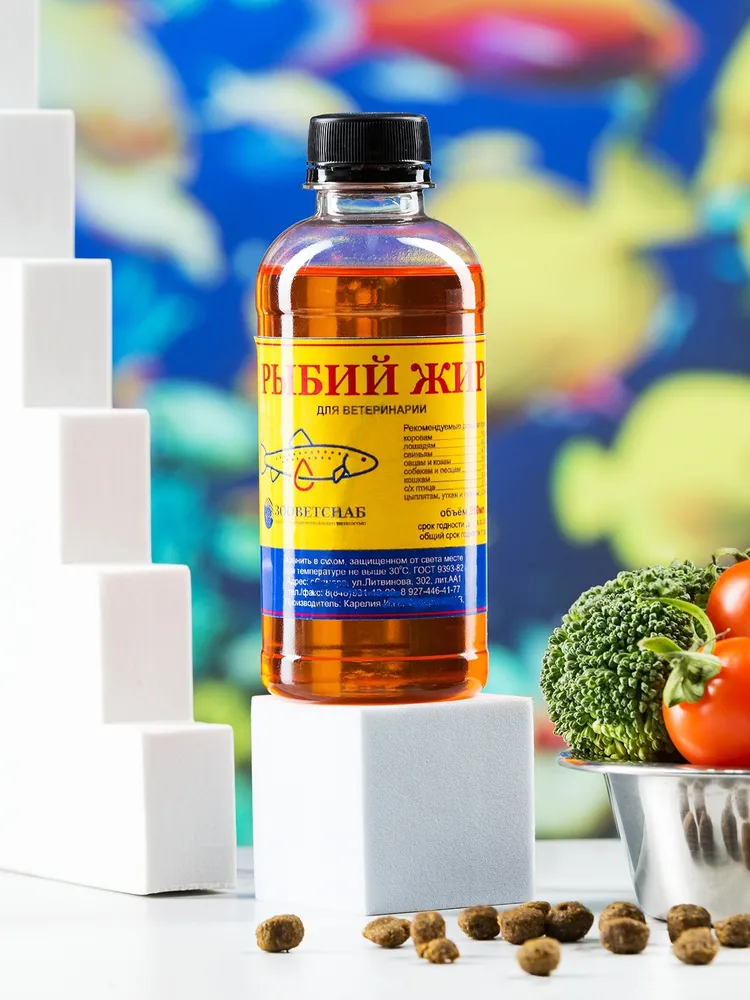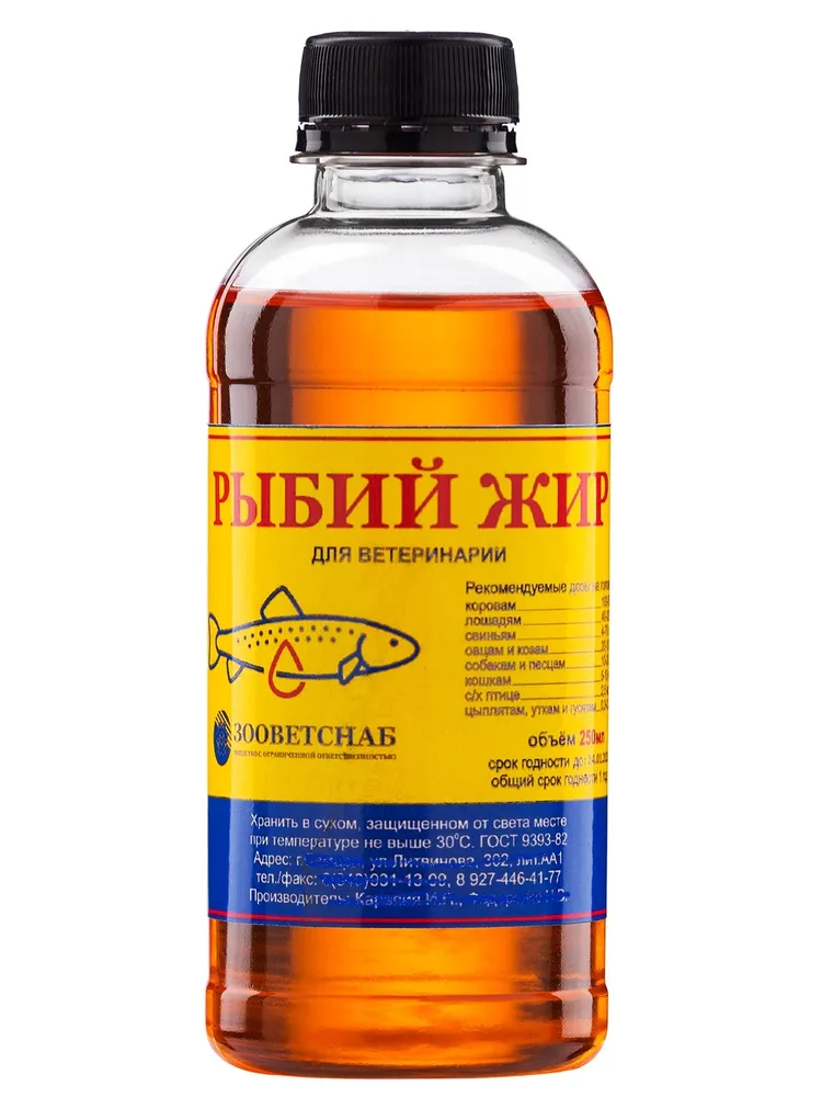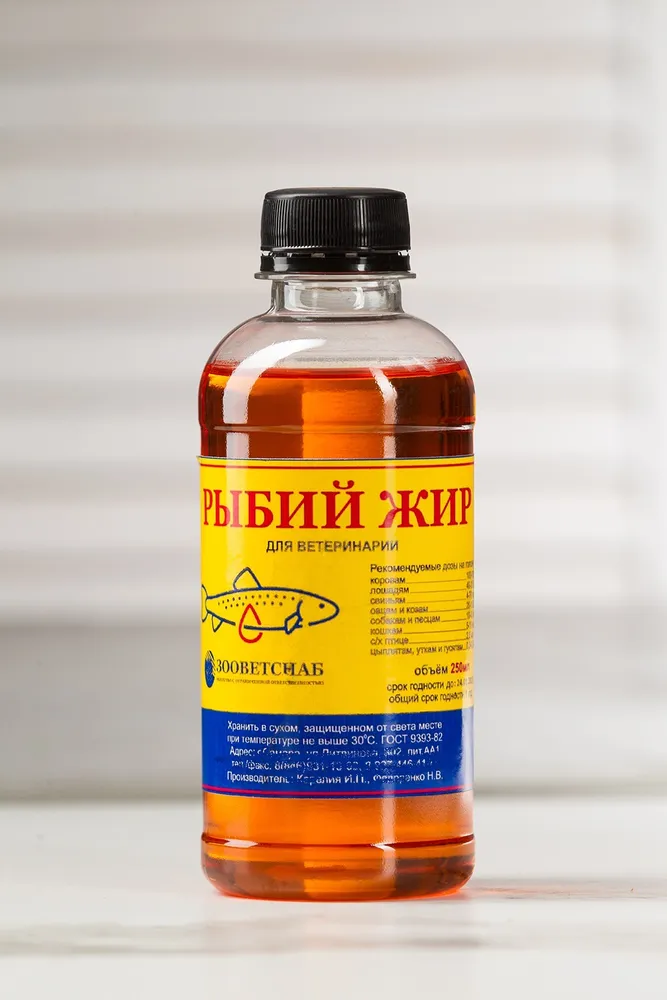 Pыбий жир (лососевое масло):Содержание Omega 3 - 10.5%, Omega 6 - 16.6%.Рыбий жир (лососевое масло) для животных ветеринарный форелевый ГОСТ 9393-82.Жир производится в Карелии на новом современном оборудовании, что гарантирует его качество.Экологически чистый продукт. Без ГМО.Масло лосося используют как добавку в пищу сельскохозяйственным и домашним животным. Рекомендуем к употреблению собакам и кошкам.Масло лосося производится из свежевыловленной фермерской форели, что гарантирует качество продукта. Форель потребляет только натуральный и безопасный корм.Рыбий жир ветеринарный форелевый (лососевое масло) – добавка кормовая для нормализации обмена веществ у животных, в том числе птиц. По внешнему виду представляет собой маслянистую жидкость, от светло-желтого до светло-коричневого цвета.Биологические свойства кормовой добавки обусловлены содержанием биологически активных веществ, а именно: рыбий жир является природным источником витаминов A, D и Е, брома, йода, полиненасыщенных жирных кислот, органических соединений серы и фосфора.Рекомендации по кормлению