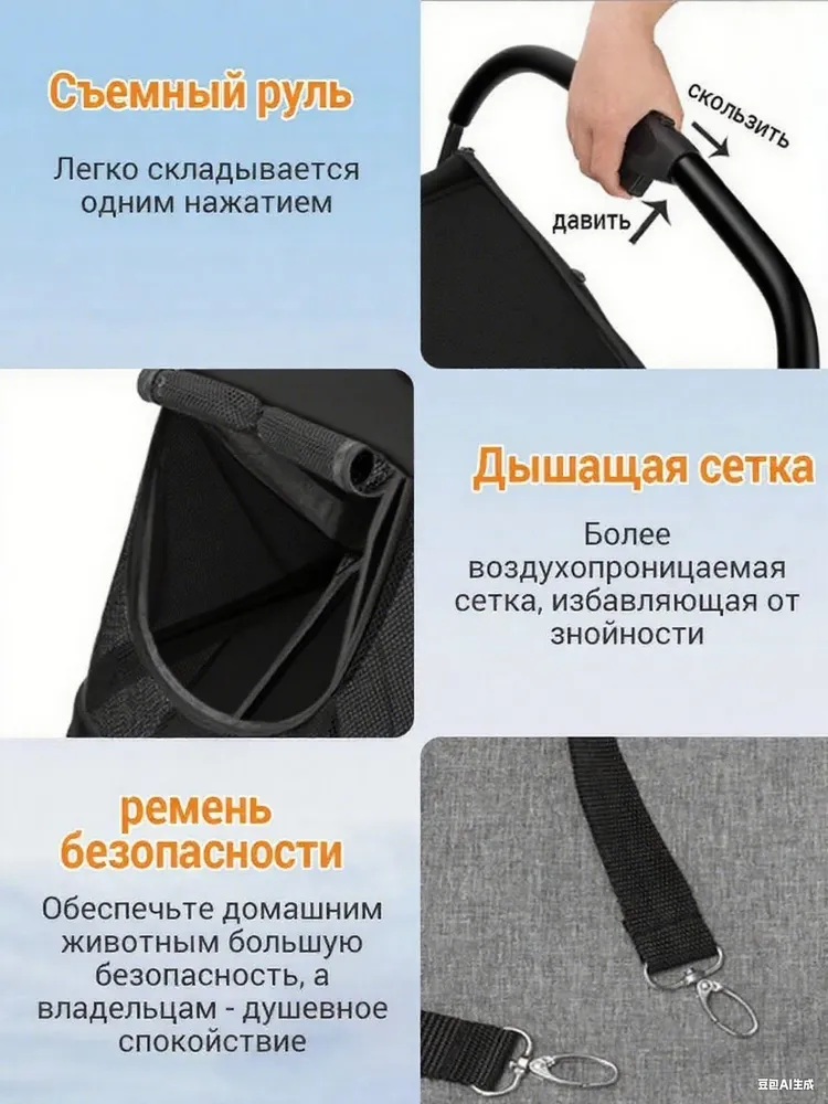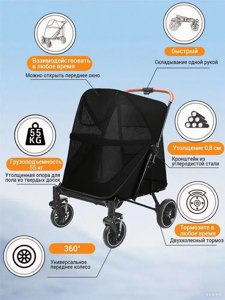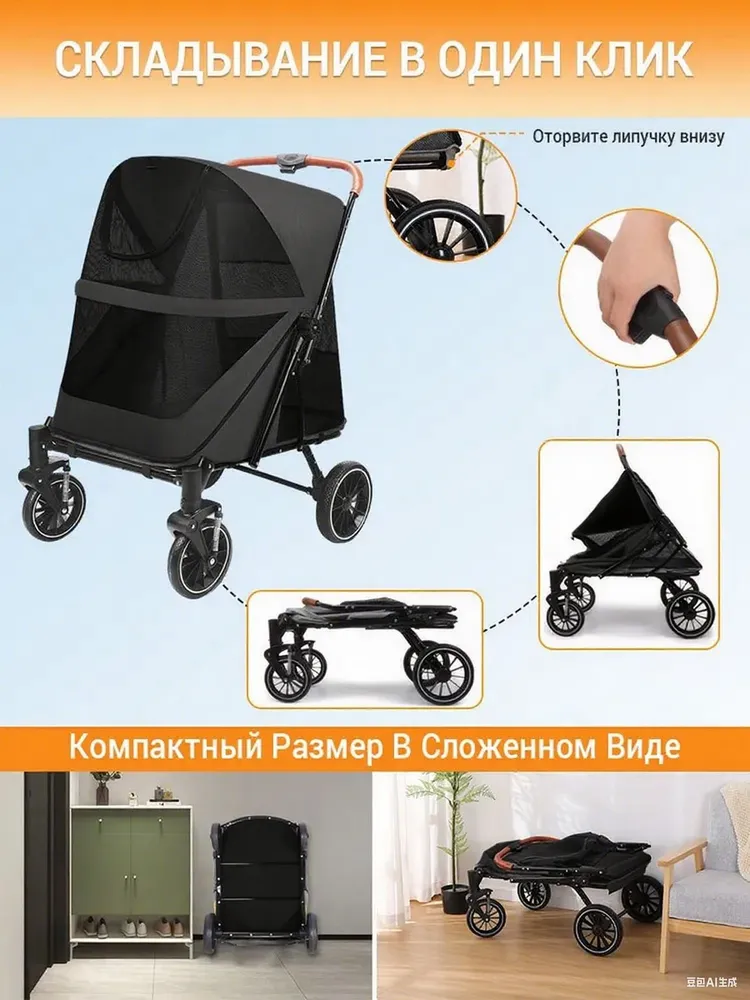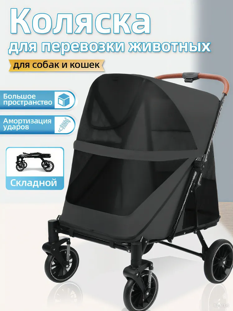 Коляска для перевозки животных Большая коляска прогулочная для собак и кошек, для средних и крупных пород.Складывание в один клик:Благодаря складывающейся коляске для собак one-click, которая легко переносится и предназначена для быстрого использования одной рукой. Идеально подходит для хранения в багажнике автомобиля во время путешествий или прогулок на свежем воздухе с вашим питомцем.Возможность двойного входа:обеспечивает удобный вход и выход для домашних животных через передний или задний вход, подходит для пожилых собак или собак с проблемами суставов. В комплект входит съемная мягкая подушка для дополнительного комфорта.Вездеходность:большие 11-дюймовые задние колеса из резины и пластика с двойными тормозами и 8-дюймовые передние колеса для поворота на 360° и амортизации.Безопасность и хранение:Оснащен регулируемыми поводками для нескольких домашних животных.Просторный и вентилируемый:Просторный салон размером 50х70х73 см с открывающимися окнами и мансардным окном, изготовленным из прочной на разрыв сетки, обеспечивает превосходную циркуляцию воздуха, снижает беспокойство домашних животных и облегчает наблюдение.Идеальный подарок для любителей домашних животных:удивите своих близких этой стильной и практичной коляской для собак. Это идеальный подарок для владельцев домашних животных, которые любят путешествовать и гулять на свежем воздухе со своими пушистыми компаньонами.