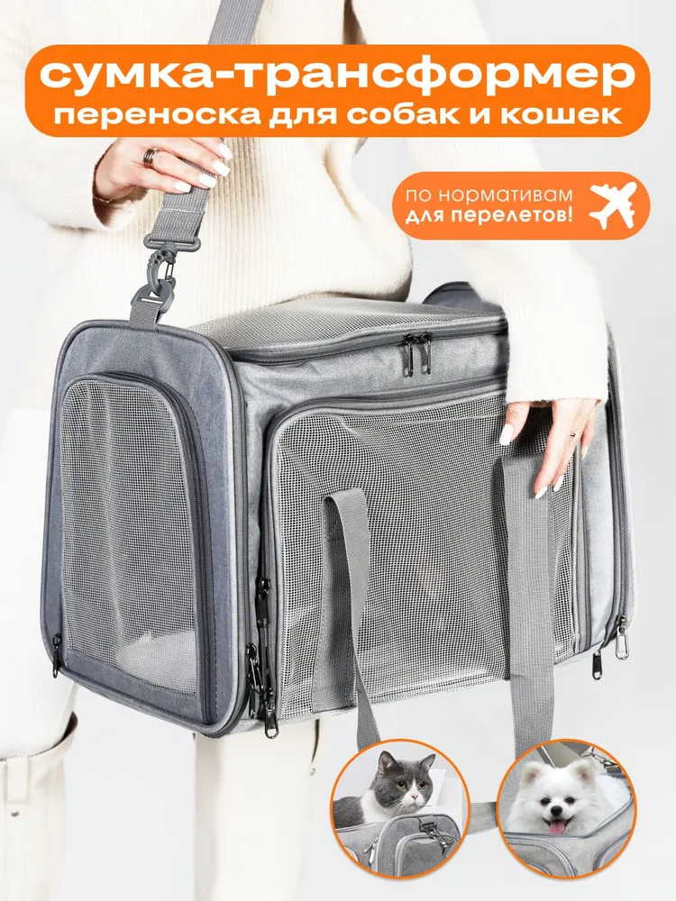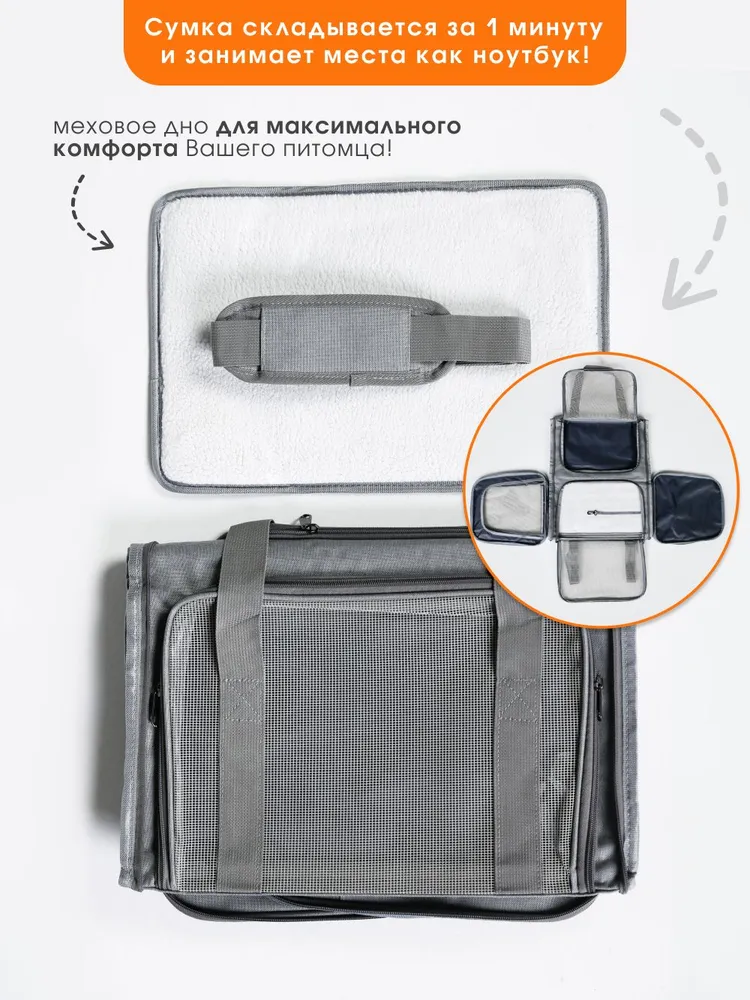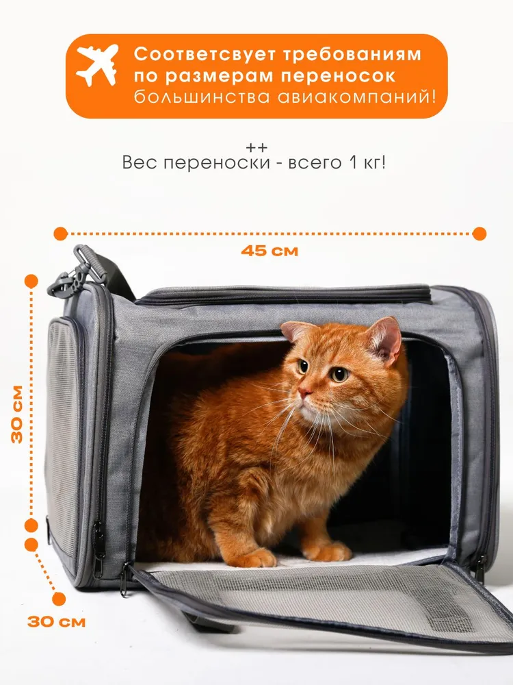 Размер переноски 45х30х30 см, что соответствует требованиям РЖД и практически всех авиакомпаний.Усиленное дно выдерживает до 11 кг.Переноска полностью складывается, размер в сложенном виде 45х30 см.Максимум воздуха