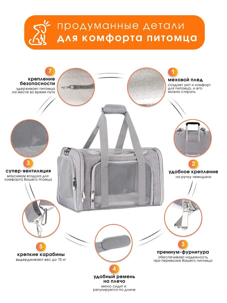 В переноске есть крепление безопасности. Оно удерживает питомца на месте во время пути.Качественная премиум фурнитура обеспечивает надёжность при перевозке, а крепкие карабины выдержат вес до 15 кг.Сделано с любовью и заботой