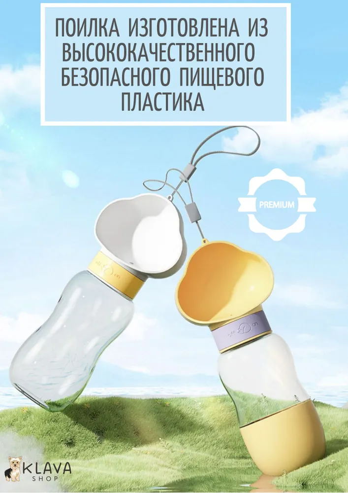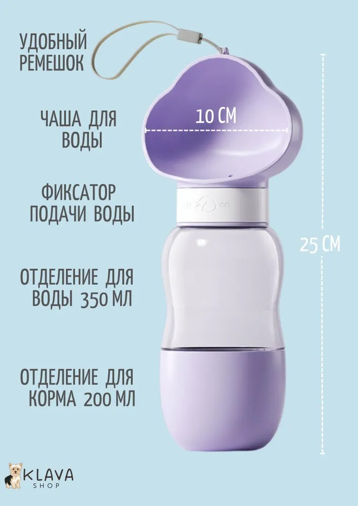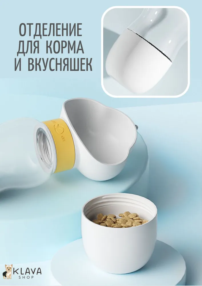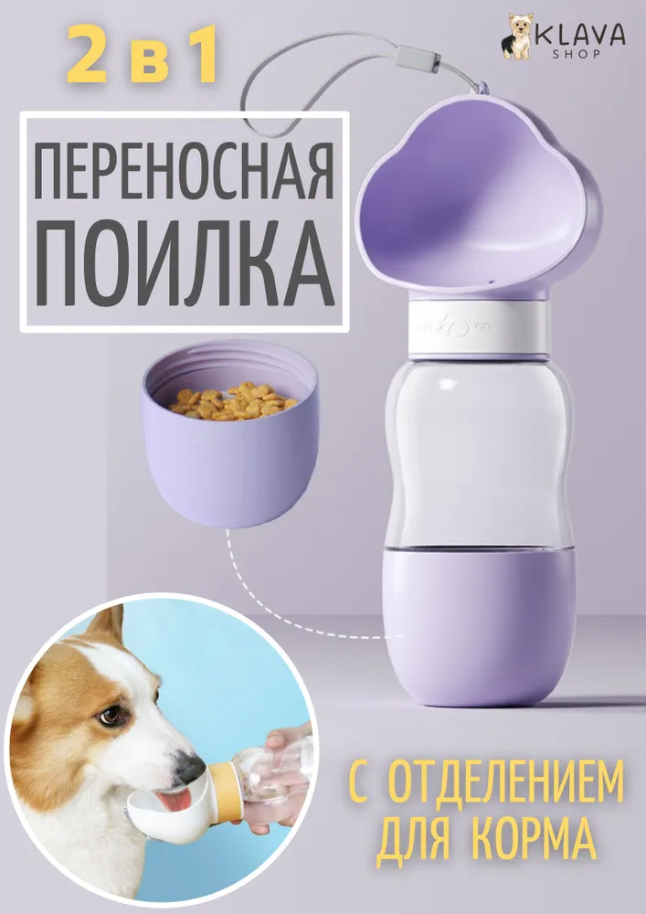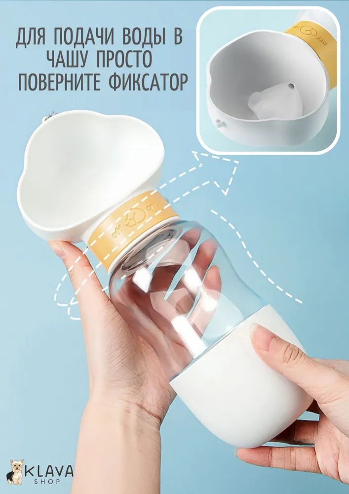 Переносная портативная поилка для животных – незаменимый аксессуар для долгих летних прогулок и путешествий с вашим любимым питомцем. Большая уличная бутылка для воды с кормушкой 2 в 1 пригодится в дороге, если ваш кот или пес путешествует в переноске или в клетке. Поильник состоит из емкости объёмом 350 мл и отделения для корма объёмом 200 мл, которое служит в качестве миски. При повороте фиксатора, вода через отверстие поступает в чашу. Наполнение чаши регулируется углом наклона поилки. Воду можно слить обратно в бутылочку. Поильник для питомцев изготовлен из высококачественного безопасного пищевого пластика, отвечает всем требованиям качества, прослужит вам долгие годы. Благодаря портативной поилке всегда будет под рукой свежая вода и перекус в виде корма или лакомств, которые незаменимы для дрессуры на свежем воздухе. Возьмите этот аксессуар с собой в автомобиль, поезд или самолет, и ваш питомец будет доволен. Походный поильник легко помещается в сумку или рюкзак, а также в велосипедный держатель для бутылок. Он незаменим при выездах на природу и на дачу, на пляж или на пикник. Оптимальный объем подойдет для собак мелких и средних пород, кошек и для других питомцев – грызунов, кроликов, хорьков, шиншилл, хомяков, морских свинок.