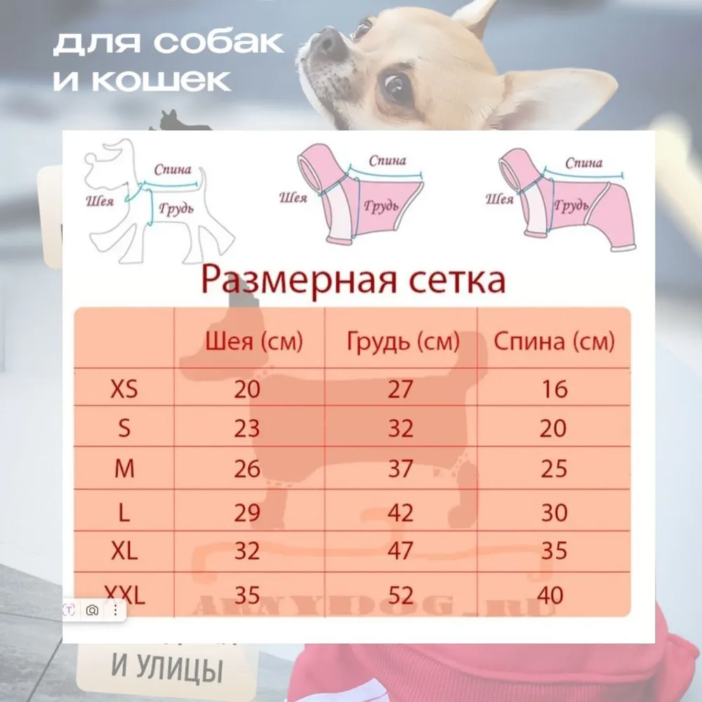 Мягкий трикотаж с начесом внутри. Застежка на кнопках. Комбинезон для собак мелких и средних пород представлен в размерах XS-20см. S -25 см. М - 30 см. L- 35 см. XL- 40 см. XXL-45 см. Придерживая собаку в положении стоя измерьте длину от основания хвостика до холки, получится длинна спинки. Размеры можно посмотреть на фото. Отличная одежда для собак мелких и средних пород собак и кошек. Комбинезон для животных защитит от пыли, ветра, выполнен из приятного на ощупь трикотажа. Очень комфортный и не сковывает движения Вашего любимца. Очень яркий и современный спортивный костюм в котором весело гулять с хозяином или использовать как домашний костюм-пижаму. Собака в толстовке чувствует себя комфортно и свободно не перегревается при активном движении, но и не мерзнет. Застежка на кнопках позволяет быстро одеть Дождевик для животного, когда так хочется гулять! Капюшон защитит голову и шею от ветра, пыли и холода. Рубашка для животных очень красивая, стильная, надежная и удобная , отлично подходит для каждодневного использования. Комбинезон ADIDOG для животных легко стирается и быстро сохнет. Ваш питомец будет всегда в поле вашего зрения и эта одежда для собак отлично с этим справиться. Костюм универсальный , подойдет на любое время года . Костюм-комбинезон для собак и кошек вызовет у вас только положительные эмоции. Этот Свитер для собак -идеальный для вашего Питомца !