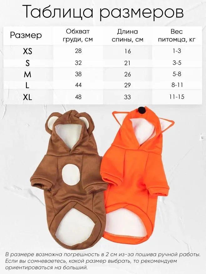 Толстовка для животных "Мишка" от бренда "Собака Одета" – идеальное решение для защиты вашего любимца от холода. Этот костюм мишка разработан специально для собак мелких пород, а также для котов и кошек, включая лысых, и предлагает универсальный дизайн, подходящий как для самцов, так и для самок. Толстовка изготовлена из высококачественного акрила и вискозы, обеспечивая тепло и комфорт. Оригинальный рисунок лисички добавит веселья и стиля в повседневную жизнь вашего питомца. Универсальный и функциональный дизайн сделает этот костюм неотъемлемым аксессором для прогулок зимой.